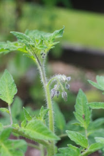 Tomatoes!! These I am also trying in hanging baskets. All of the seeds I planted germinated this year so we have a gazillion (ok, maybe 14 or 15) tomato plants in the garden. Nine in hanging baskets and several out in the garden. The one below actually has some blossoms starting on it! I think it's a yellow tomato one that I bought started from the farmer's market.